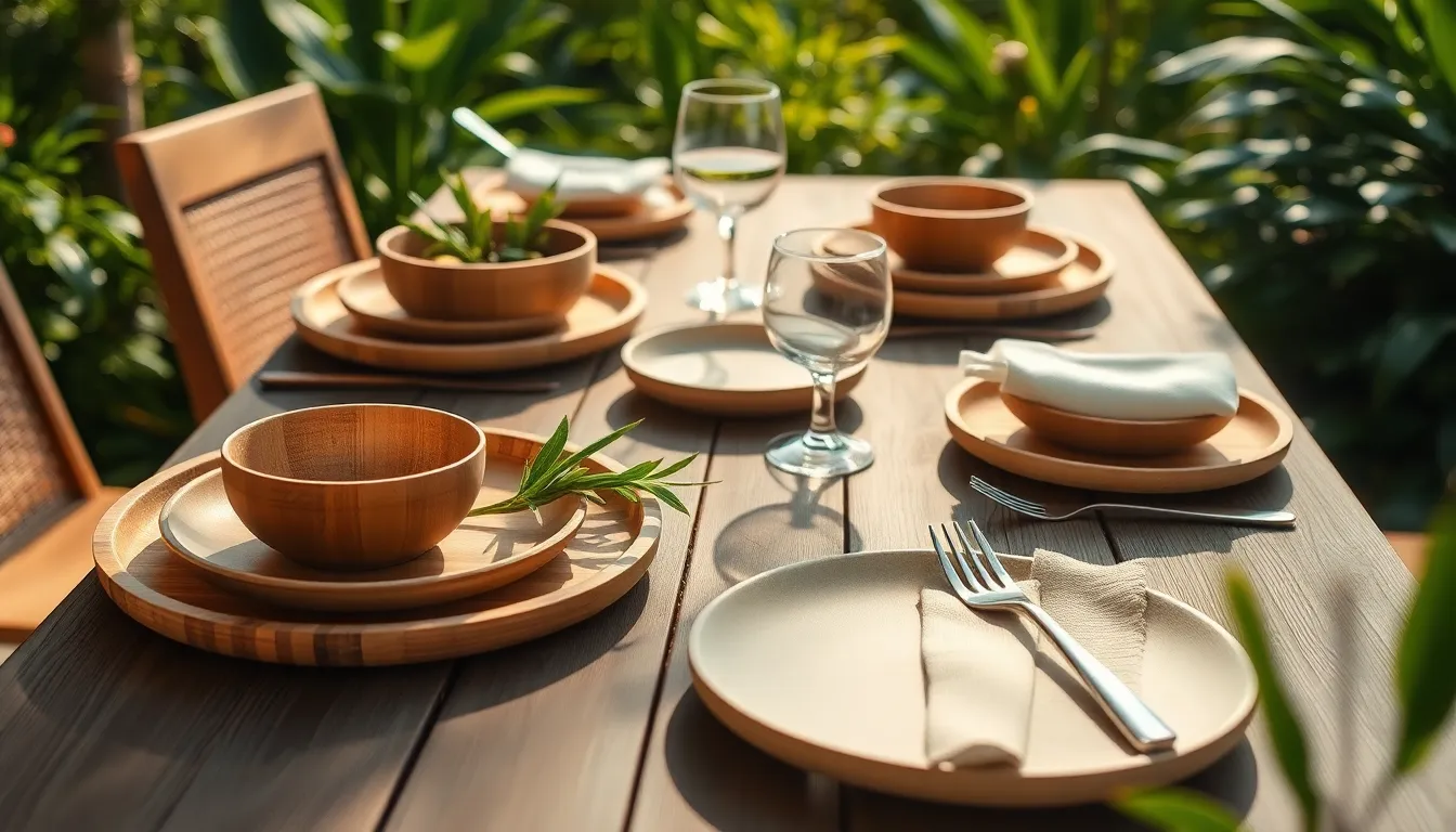 Bamboo dinnerware stands out for its durability and renewable nature. Made from fast-growing bamboo, it provides a lightweight option with natural antibacterial properties. Many brands offer bamboo plates, bowls, and utensils, appealing to health-minded consumers. Biodegradable materials, like wheat straw and recycled plastics, also gain popularity. These alternatives contribute to waste reduction by decomposing in landfills. Additionally, melamine designed with recycled content offers a sturdy choice for outdoor settings. Manufacturers emphasize organic materials, ensuring that consumers enjoy stylish dinnerware without harming the planet. With each option, selecting sustainably sourced products fosters a greener dining experience while maintaining aesthetic appeal.